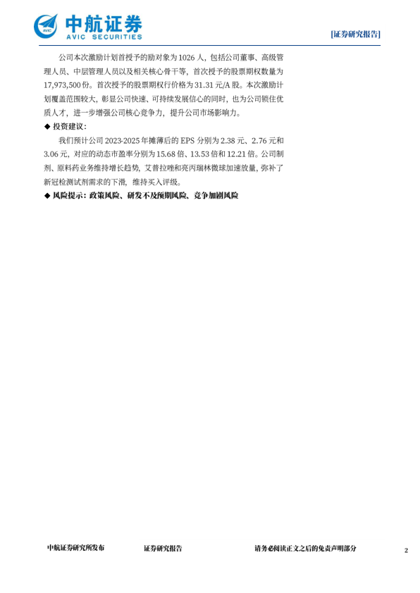我们预计公司2023-2025年摊薄后的EPS分别为2.38元、2.76元和3.06元,对应的动态市盈率分别为15.68倍、13.53倍和12.21倍。公司制剂、原料药业务维持增长趋势,艾普拉唑和亮丙瑞林微球加速放量,弥补了新冠检测试剂需求的下滑、维持买入评级。