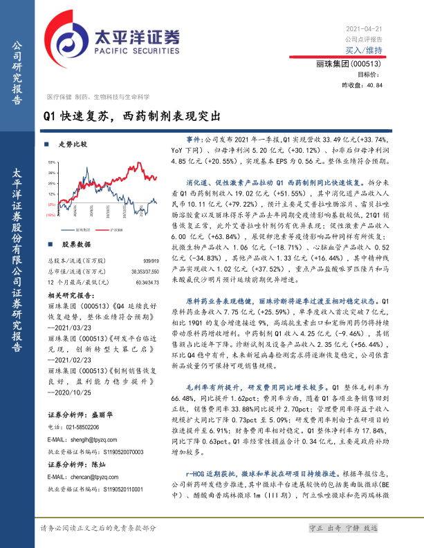 丽珠集团2021年第一季度业绩表现强劲,营收和归母净利润均实现显著增长,主要得益于西药制剂业务的快速复苏,特别是消化道和促性激素产品贡献突出。原料药和诊断业务也保持稳健增长。公司毛利率有所提升,研发投入持续增加以推进创新管线。微球和生物药平台多个在研项目进展顺利,有望在未来贡献新的增长点。基于公司稳健的经营表现和积极的研发进展,报告维持了“买入”评级,并预计未来几年营收和净利润将持续增长。同时,报告也提示了制剂产品降价、研发获批不及预期以及市场竞争加剧等潜在风险。