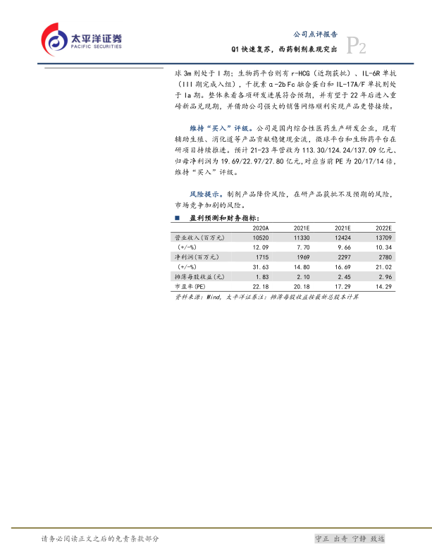 维持“买入”评级。公司是国内综合性医药生产研发企业,现有辅助生殖、消化道等产品贡献稳健现金流,微球平台和生物药平台在研项目持续推进。预计21-23年营收为113.30/124.24/137.09亿元、归母净利润为19.69/22.97/27.80亿元,对应当前PE为20/17/14倍,维持“买入”评级。