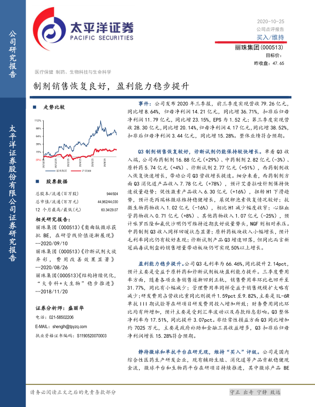 第三季度,公司制剂销售恢复良好,诊断试剂保持较快增长,带动营收增长提速。