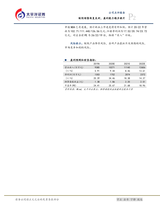 风险提示。制剂产品降价风险,在研产品获批不及预期的风险,市场竞争加剧的风险。