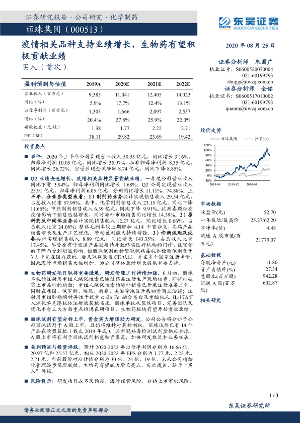 根据预测,丽珠集团2020年至2022年的归母净利润预计分别为16.66亿元、20.97亿元和25.57亿元,相应的每股收益(EPS)分别为1.77元、2.22元和2.71元。当前股价对应的估值分别为30倍、24倍和19倍。报告认为,未来公司精细化管理将逐步显现成效,生物药有望成为新的增长亮点。基于此,首次覆盖给予“买入”评级。