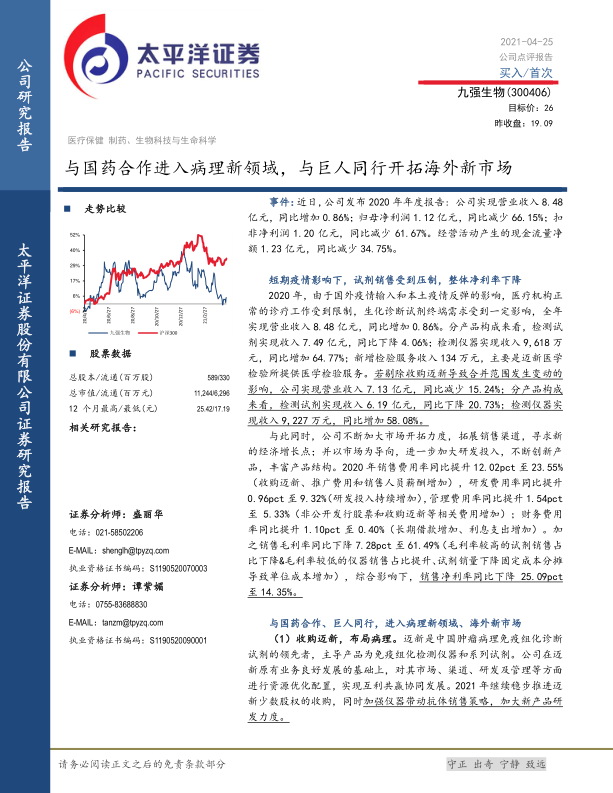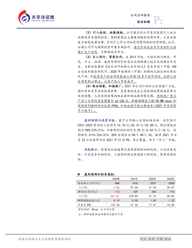 基于核心业务板块分析,太平洋证券预计九强生物2021-2023年营业收入分别为16.76亿、20.37亿、24.58亿,同比增速分别为98%、22%、21%。归母净利润分别为5.29亿、6.44亿、7.76亿,分别增长371%、22%、21%。摊薄每股收益(EPS)分别为0.90元、1.09元、1.32元。按照2021年4月23日收盘价,对应2021年21倍PE。首次覆盖,给予“买入”评级,目标价26元。