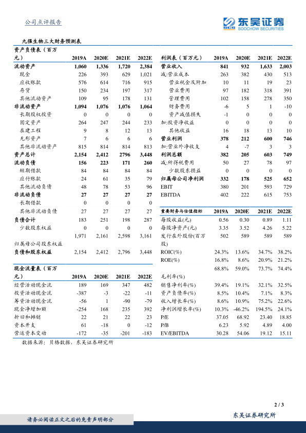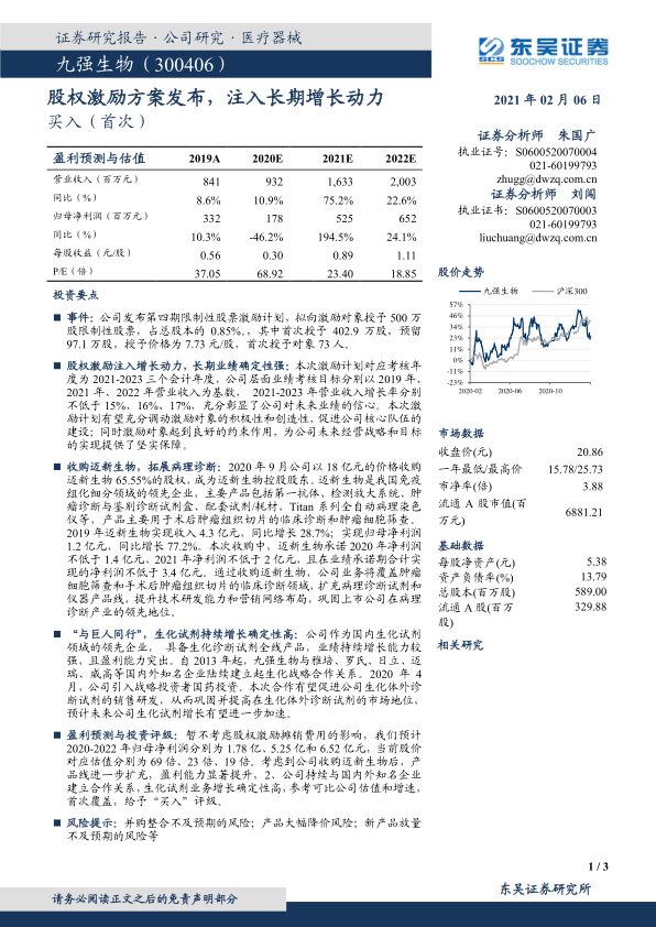 暂不考虑股权激励摊销费用的影响,预计2020-2022年归母净利润分别为1.78亿、5.25亿和6.52亿元,当前股价对应估值分别为69倍、23倍、19倍。考虑到公司收购迈新生物后,产品线进一步扩充,盈利能力显著提升,2、公司持续与国内外知名企业建立合作关系,生化试剂业务增长确定性高,参考可比公司估值和增速,首次覆盖,给予“买入”评级。