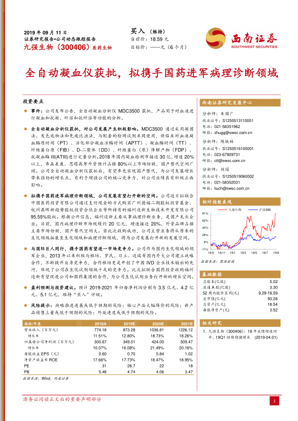 基于上述业务拓展和市场机遇,西南证券对九强生物的未来业绩进行了预测。预计公司2019年至2021年归属于母公司股东的净利润将分别达到3.5亿元、4.2亿元和5.1亿元人民币,呈现出稳健的增长态势。鉴于公司的发展前景和市场潜力,报告维持对九强生物的“买入”评级。