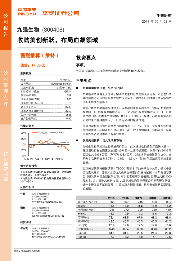 尽管九强生物在2017年初面临行业竞争加剧以及临床与注册费用增加带来的短期业绩波动,但随着与雅培技术转让里程碑款的结算,预计公司业绩将逐步回归良好水平。分析师基于对九强生物此次战略性并购的积极评估及其在体外诊断领域的长期发展潜力,维持“强烈推荐”的投资评级。报告预测,在不考虑其他尚未确定的并购事项的情况下,公司2017年至2019年的每股收益(EPS)将持续增长,分别为0.60元、0.70元和0.82元。这一积极的财务预测充分体现了市场对公司未来业绩增长、战略布局及其在行业内持续创新能力的信心,预示着公司在完成此次收购后将迎来新的发展机遇。