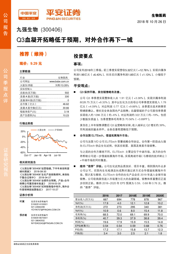 本报告分析了九强生物2018年三季报,指出公司Q3业绩平稳但略低于预期,美创子公司业务改善程度有限。公司通过与法国ELITEech合作,有望拓展海外市场。维持公司“推荐”评级,但需关注合作进度、产品推广和降价风险。