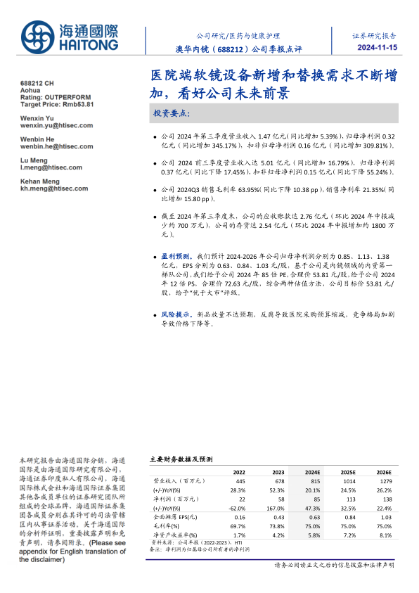 盈利预测。我们预计2024-2026年公司归母净利润分别为0.85、1.13、1.38亿元,EPS分别为0.63、0.84、1.03元/股,基于公司是内镜领域的内资第一梯队公司,我们给予公司2024年85倍PE,合理价53.81元/股,给予公司2024年12倍PS,合理价72.63元/股,综合两种估值方法,公司目标价53.81元/股,给予“优于大市”评级。