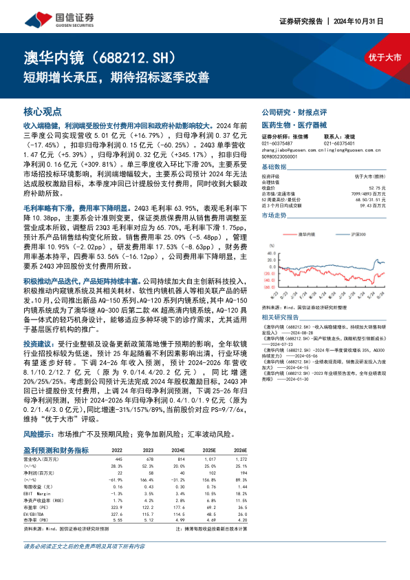 澳华内镜在2024年前三季度营收保持增长,但利润受招投标环境、股权激励费用冲回及政府补助等非经常性因素影响较大。第三季度单季利润因费用冲回和政府补助而显著提升,但营收环比下滑显示市场短期承压。公司通过持续的产品创新和新品发布,如4K超高清内镜系统和适用于基层医疗的产品,积极丰富产品线并拓展市场。尽管短期内行业招投标环境低迷,但预计2025年起行业环境将逐步改善。基于对市场环境的最新评估,分析师下调了未来三年的收入预测,并调整了净利润预测,但仍维持“优于大市”的投资评级,体现了对公司长期发展潜力的信心。