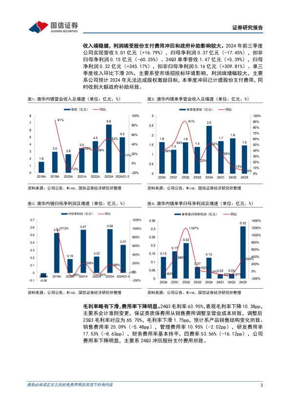 收入端稳健,利润端受股份支付费用冲回和政府补助影响较大。2024年前三季度公司实现营收5.01亿元(+16.79%),归母净利润0.37亿元(-17.45%),扣非归母净利润0.15亿元(-60.25%)。24Q3单季营收1.47亿元(+5.39%),归母净利润0.32亿元(+345.17%),扣非归母净利润0.16亿元(+309.81%)。单三季度收入环比下滑20%,主要系受市场招投标环境影响,利润端增幅较大,主要系公司预计2024年无法达成股权激励目标,本季度冲回已计提股份支付费用,同时收到大额政府补助所致。