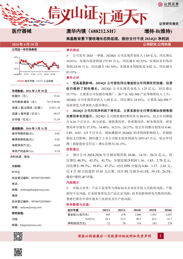 澳华内镜在2024年第一季度展现了强劲的营收增长势头,尽管面临高基数挑战,其核心产品AQ-300的持续发力确保了业绩的稳健提升。然而,当期归母净利润受到股权激励产生的股份支付费用显著影响而大幅下滑,若剔除此非经常性因素,公司实际盈利能力仍保持增长。分析师对公司未来发展持乐观态度,预计营收和净利润将持续高速增长,并维持“增持-B”的投资评级,但同时提示了市场竞争、产能、政策及技术创新等潜在风险。整体而言,澳华内镜在医疗器械市场中展现出良好的成长潜力,短期利润波动主要受会计处理影响,长期增长逻辑依然清晰。