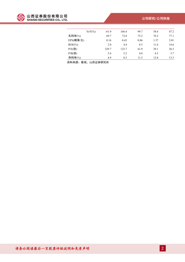预计公司2024-2026年分别实现营收10.06、14.33、20.31亿元,同比增长48.3%、42.5%、41.7%;分别实现净利润1.16、1.83、2.70亿元,同比增长99.7%、58.6%、47.2%;对应EPS分别为0.86、1.37、2.01元,以4月30日收盘价53.41元计算,对应PE分别为61.9X、39.1X、26.5X,维持“增持-B”评级。