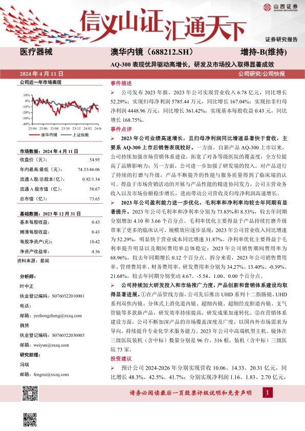 澳华内镜2023年业绩表现强劲,主要受益于AQ-300的成功和公司在研发及市场方面的持续投入。盈利能力显著提升,未来增长潜力可期。维持“增持-B”评级,但需关注市场竞争、产能、政策、研发以及奥林巴斯本土化等风险因素。