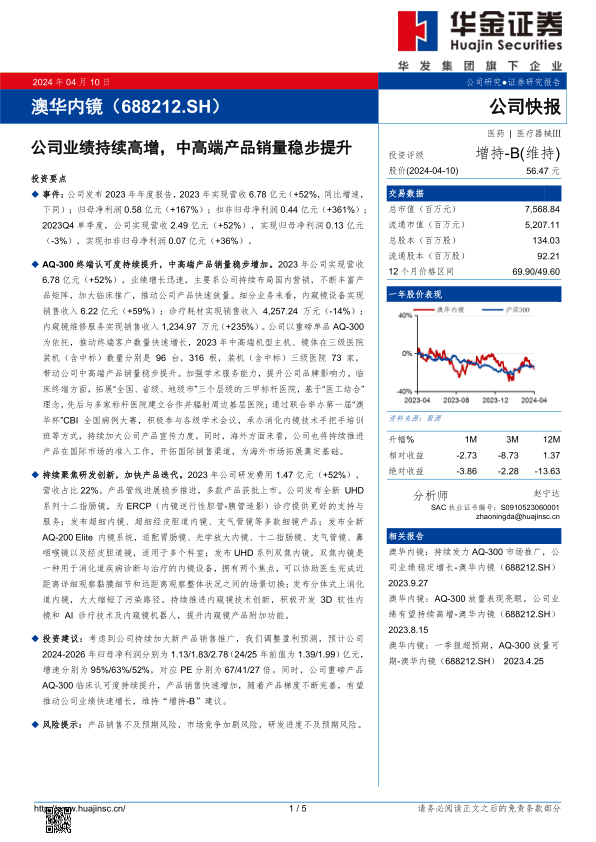 澳华内镜在2023年展现出强劲的增长势头,营收和净利润均实现大幅增长,核心驱动力在于其中高端产品AQ-300的市场成功推广和终端认可度提升。公司在内窥镜设备领域表现突出,同时积极投入研发,不断丰富产品线并推出创新产品,如UHD系列和AQ-200Elite系统,以满足多科室需求并提升诊疗效率。此外,公司在巩固国内市场的同时,也积极布局国际市场。尽管面临产品销售、市场竞争和研发进度的风险,但鉴于其持续的产品创新和市场拓展策略,预计未来业绩将保持高速增长,投资评级维持“增持-B”。