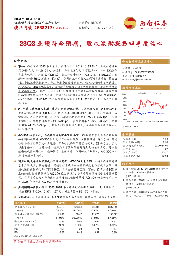 本报告对澳华内镜(688212)2023年三季报进行了分析,核心观点如下: