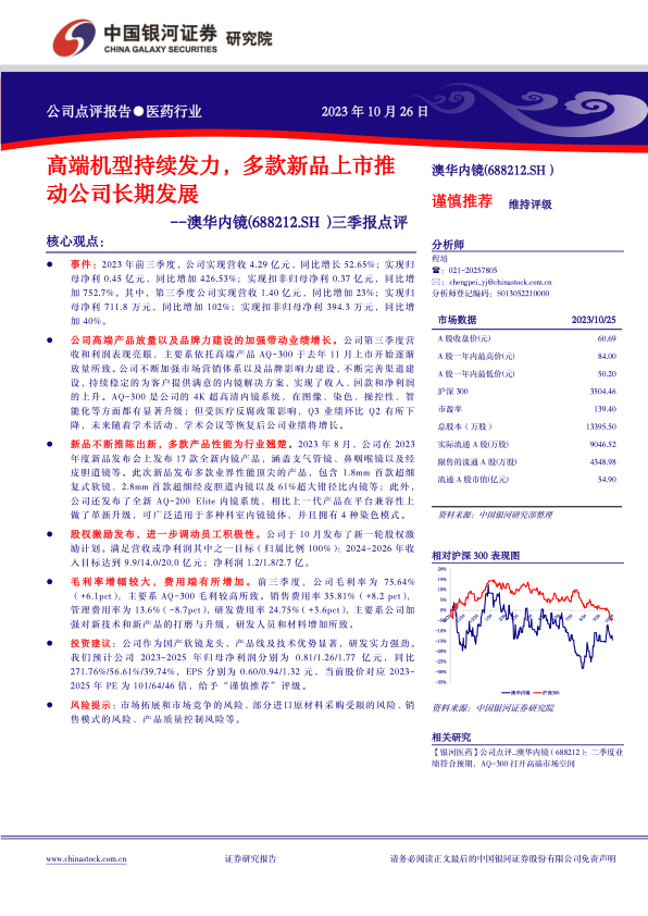 澳华内镜在2023年前三季度展现出强劲的增长势头,营收和净利润均实现大幅增长,核心驱动力在于其高端产品AQ-300的成功放量以及公司在市场营销和品牌建设方面的持续投入。尽管短期内受到医疗反腐政策的影响,但公司通过不断推出具有行业领先性能的新产品,并实施股权激励计划,为未来的长期发展奠定了坚实基础。分析师基于公司显著的产品和技术优势以及强劲的研发实力,对其未来业绩增长持乐观态度,并给予“谨慎推荐”评级,但同时也提示了市场竞争、供应链和销售模式等潜在风险。