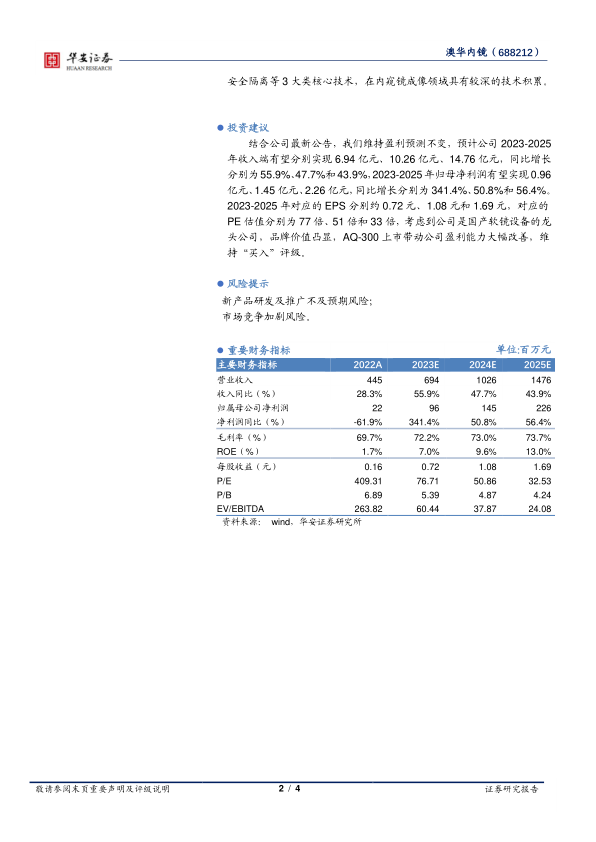 结合公司最新公告,我们维持盈利预测不变,预计公司2023-2025年收入端有望分别实现6.94亿元、10.26亿元、14.76亿元,同比增长分别为55.9%、47.7%和43.9%,2023-2025年归母净利润有望实现0.96亿元、1.45亿元、2.26亿元,同比增长分别为341.4%、50.8%和56.4%。2023-2025年对应的EPS分别约0.72元、1.08元和1.69元,对应的PE估值分别为77倍、51倍和33倍,考虑到公司是国产软镜设备的龙头公司,品牌价值凸显,AQ-300上市带动公司盈利能力大幅改善,维持“买入”评级。