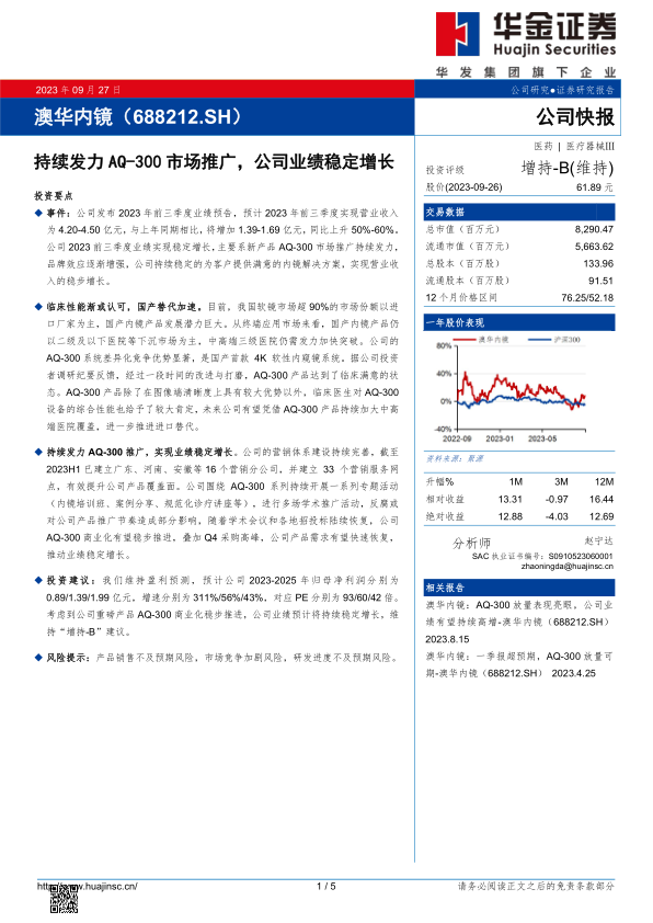 华金证券维持对澳华内镜的“增持-B”投资建议,并维持盈利预测。预计公司2023-2025年归母净利润分别为0.89亿元、1.39亿元和1.99亿元,同比增速分别为311%、56%和43%。对应的P/E估值分别为93倍、60倍和42倍。考虑到重磅产品AQ-300商业化稳步推进,公司业绩预计将持续稳定增长。同时,报告提示了产品销售不及预期、市场竞争加剧以及研发进度不及预期等风险。