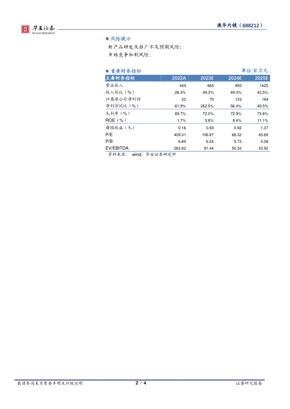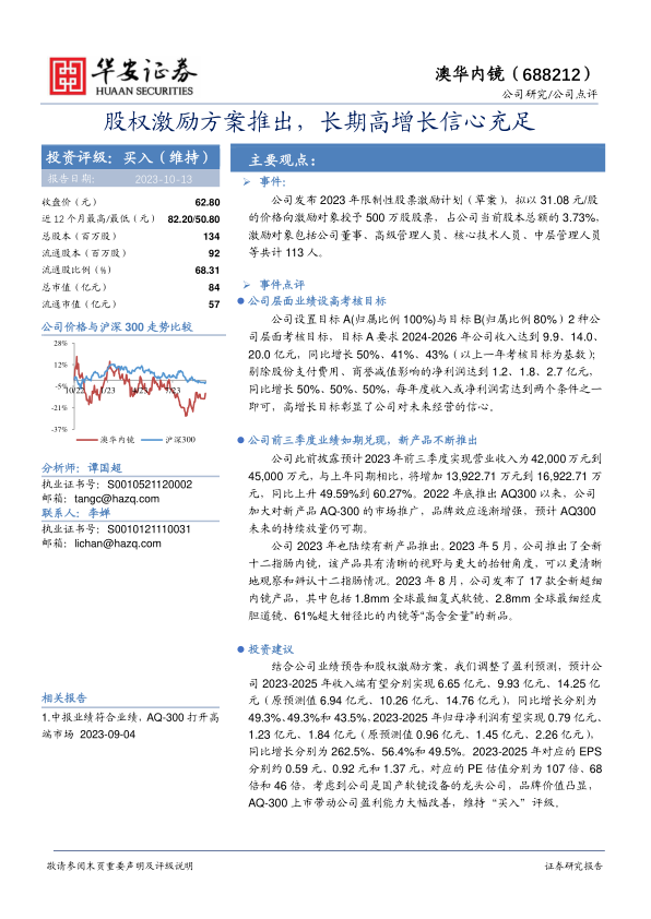 结合公司业绩预告和股权激励方案, 我们调整了盈利预测, 预计公司 2023-2025 年收入端有望分别实现 6.65 亿元、 9.93 亿元、 14.25 亿元( 原预测值 6.94 亿元、 10.26 亿元、 14.76 亿元), 同比增长分别为49.3%、 49.3%和 43.5%, 2023-2025 年归母净利润有望实现 0.79 亿元、1.23 亿元、 1.84 亿元( 原预测值 0.96 亿元、 1.45 亿元、 2.26 亿元),同比增长分别为 262.5%、 56.4%和 49.5%。 2023-2025 年对应的 EPS分别约 0.59 元、 0.92 元和 1.37 元,对应的 PE 估值分别为 107 倍、 68倍和 46 倍,考虑到公司是国产软镜设备的龙头公司,品牌价值凸显,AQ-300 上市带动公司盈利能力大幅改善, 维持“买入” 评级。