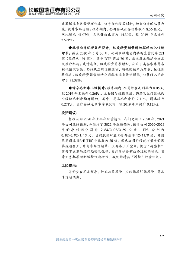鹭燕医药2020年上半年业绩受到疫情一定程度的影响,但公司通过零售业务的快速增长和医疗器械业务的高速发展,以及省外市场的积极拓展,保持了整体的增长态势。 报告期内,公司综合毛利率小幅提升,盈利能力有所增强。 维持“增持”评级,但需关注并购整合、政策、应收账款和药品降价等风险。