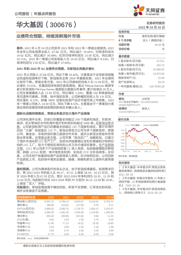 本报告认为华大基因2021年和2022年一季度业绩符合预期,尽管受新冠相关业务影响整体收入有所下降,但常规业务稳步增长,国际化战略持续推进。报告上调了对公司未来收入和利润的预测,并上调评级至“买入”。投资者应关注新冠疫情进展、研发进度、汇率变化以及海外业务推进情况等风险因素。