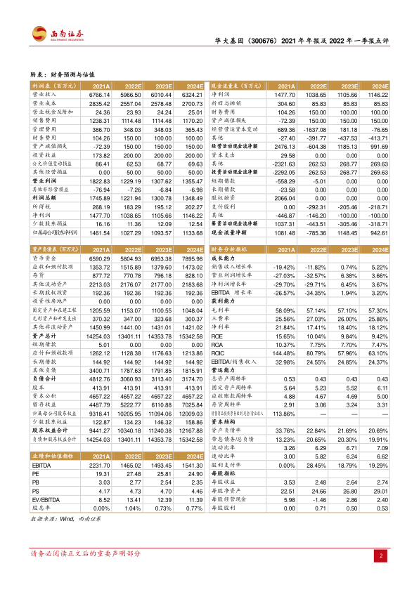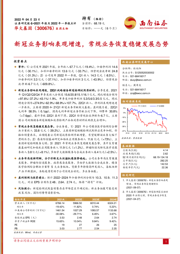 西南证券研究发展中心对华大基因的盈利进行了预测。预计公司2022年至2024年的归母净利润分别为10.3亿元、10.9亿元和11.3亿元。对应的每股收益(EPS)分别为2.48元、2.64元和2.74元。基于这些预测,分析师维持对华大基因的“持有”评级。