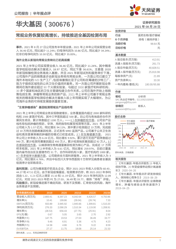 华大基因2021年上半年业绩受新冠检测业务高基数影响,营收和净利润同比下降。然而,公司成功推动海外业务从新冠检测向常规业务转型,并实现了常规业务的显著增长。在国内市场,公司在“生育、肿瘤、感染”三大基因检测领域持续深化全产品线布局,各项常规业务均保持稳健增长,尤其肿瘤防控和感染防控业务增速亮眼。公司通过广泛的合作网络和民生项目,不断提升市场渗透率。展望未来,公司作为精准医疗龙头企业,预计常规业务将持续贡献增长,但仍需关注新冠疫情进展、研发投入、汇率波动及海外业务推进等风险。天风证券维持“持有”评级。