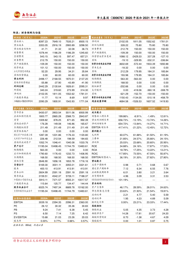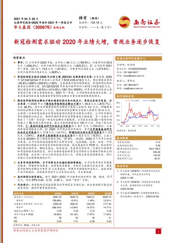 本报告分析了华大基因(300676)2020年报和2021年一季报,核心观点如下: