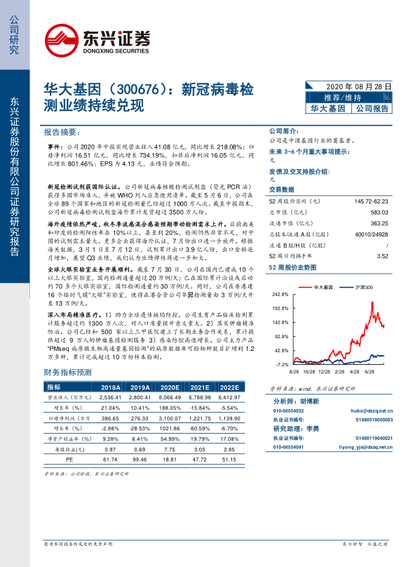 华大基因2020年上半年业绩实现显著增长,主要得益于其新冠病毒检测业务在全球范围内的快速扩张和持续兑现。公司通过“火眼”实验室的全球复制和检测试剂盒的广泛应用,不仅在全球抗疫中发挥了关键作用,也带来了可观的经济效益。同时,公司在遗传缺陷防控、肿瘤精准防治、感染防控等精准医疗领域的长期战略布局持续深化,尽管部分业务短期内受到疫情影响,但感染防控业务实现高速增长。展望未来,随着全球疫情的持续演变和国内检测常态化的需求,华大基因的新冠检测业务有望继续贡献业绩,而其在精准医疗领域的多元化发展也将为公司提供长期的增长动力。公司预计2020-2022年营业收入分别为80.66亿元、67.89亿元、64.13亿元,归母净利润分别为31.00亿元、12.22亿元、11.40亿元。投资者需关注疫情发展、产品销售及行业竞争加剧等风险。