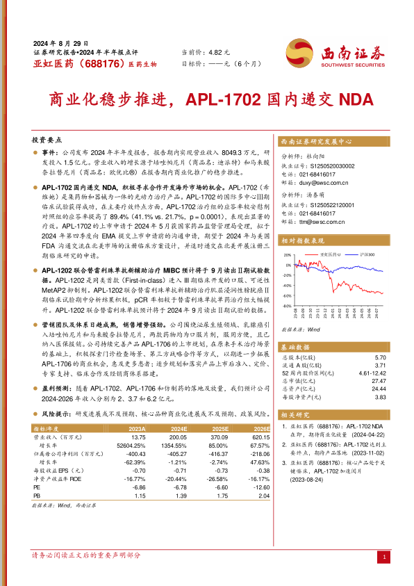 盈利预测:随着APL-1702、APL-1706和仿制药的落地及放量,我们预计公司2024-2026年收入分别为2、3.7和6.2亿元。