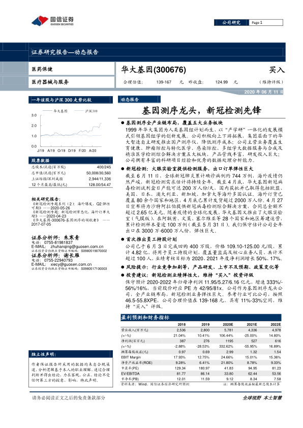 华大基因作为基因测序行业的龙头企业,凭借其全产业链布局和技术优势,在新冠疫情期间抓住了市场机遇,通过火眼实验室和新冠检测产品,实现了业绩的显著增长。维持“买入”评级,公司合理价值在139-167元之间,具有11%-33%空间。