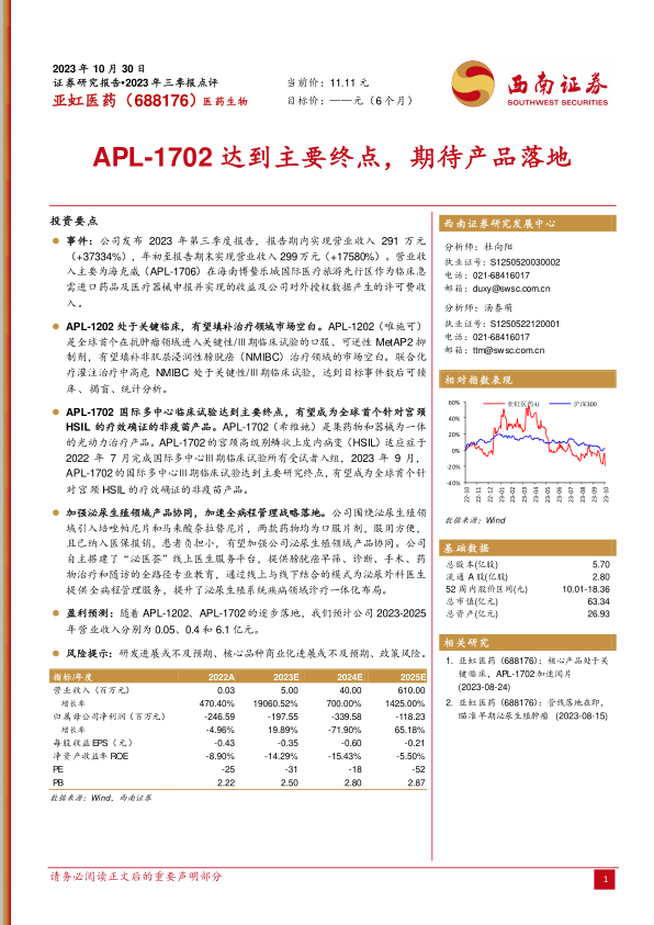 根据西南证券的盈利预测,随着APL-1202和APL-1702等核心产品的逐步落地,预计公司2023年至2025年的营业收入将分别达到0.05亿元、0.4亿元和6.1亿元,呈现高速增长态势。然而,报告也提示了潜在风险,包括研发进展或不及预期、核心品种商业化进展或不及预期以及政策风险,这些因素可能影响公司的未来业绩。