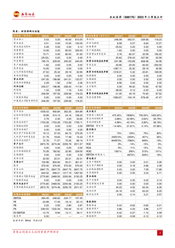 亚虹医药2023年第三季度实现营业收入291万元,同比大幅增长37334%。年初至报告期末,公司累计实现营业收入299万元,同比增长17580%。这一显著增长主要来源于APL-1706在海南博鳌乐城国际医疗旅游先行区作为临床急需进口药品及医疗器械申报并实现的收益,以及公司对外授权数据产生的许可费收入。尽管营收实现高速增长,但公司仍处于研发投入期,预计2023年归属母公司净利润为-197.55百万元。