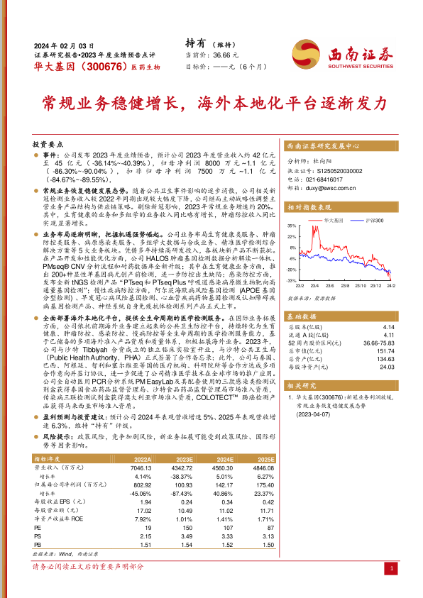 本报告显示,华大基因2023年业绩受新冠检测业务下滑影响较大,但常规业务已恢复稳健增长态势。公司在生育健康、肿瘤防控等领域持续发力,并积极拓展海外市场,与多国医疗机构达成合作,有望在国际市场取得更大突破。维持“持有”评级,但需关注政策风险和市场竞争。