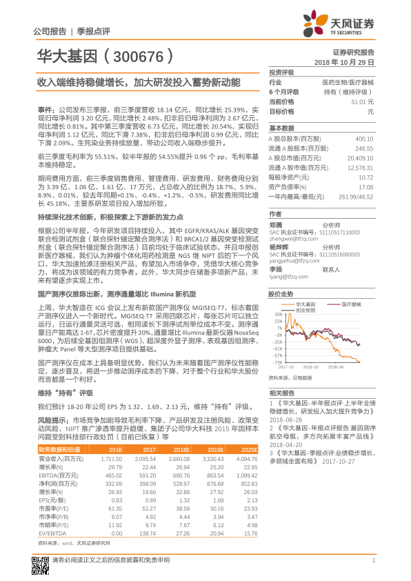本报告分析了华大基因的三季报,指出公司在收入端保持稳健增长的同时,加大了研发投入,为未来的发展奠定了基础。国产测序仪的崛起有望降低测序成本,利好整个行业。综合考虑公司业绩和行业发展趋势,维持对华大基因“持有”评级。同时,报告也提示了市场竞争、产品研发、政策变动等多项风险。
