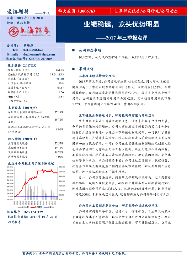 10月27日,华大基因发布2017年三季报。
