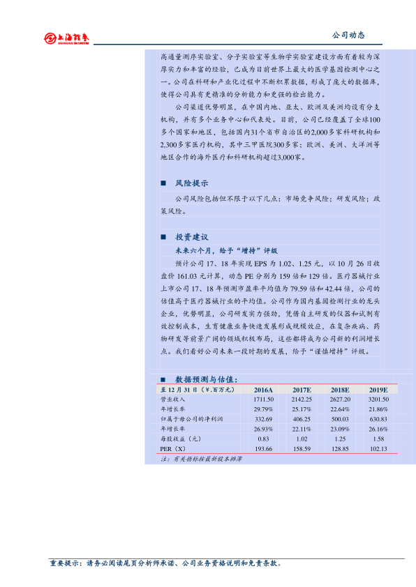 生育健康业务是公司最主要的业务,近年来实现了快速的发展,今年仍有望保持较快增速。公司在复杂疾病、药物研发等领域积极布局,尤其是肿瘤检测领域,未来发展空间巨大,这些都将成为公司新的利润增长点。