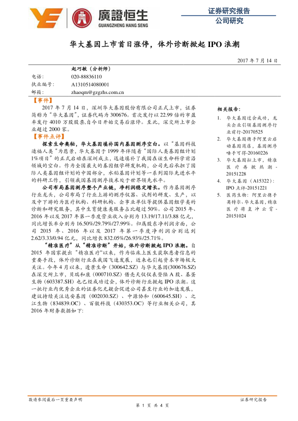 华大基因上市首日涨停,体外诊断掀起IPO浪潮