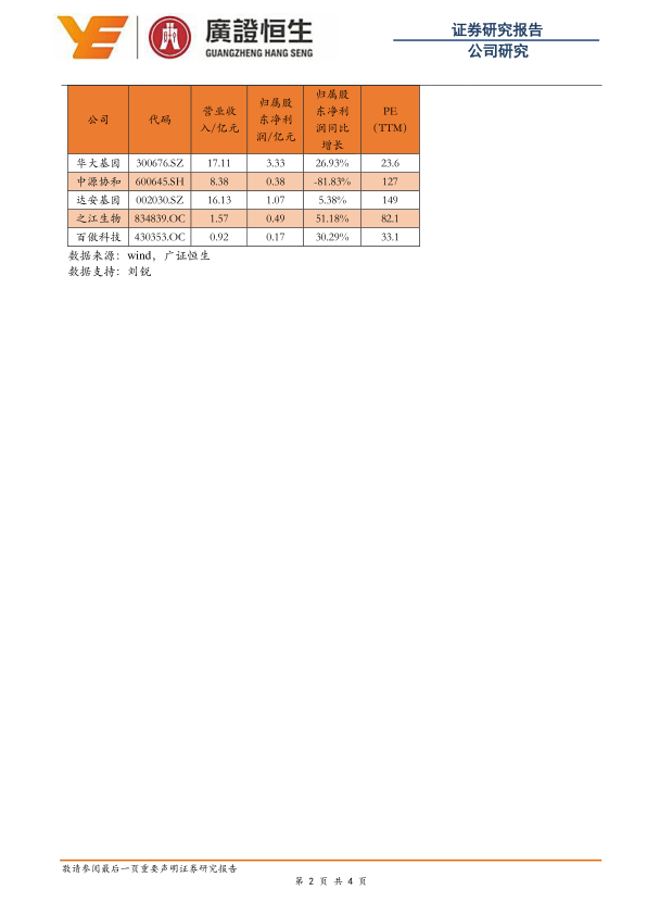 报告罗列了华大基因、中源协和、达安基因、之江生物、百傲科技等公司的财务数据,包括营业收入、归属股东净利润及同比增长率、PE(TTM)等指标,为投资者提供参考。