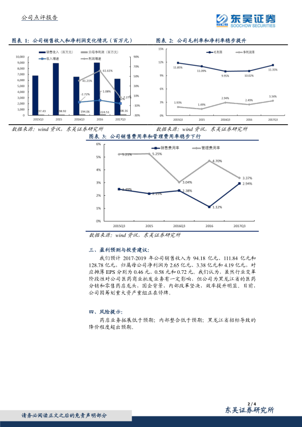 本报告对人民同泰2017年三季报进行了深入分析,认为公司在行业政策变革的背景下,通过内部改革提升经营效率,实现了收入端恢复增长和利润端稳步提升。维持对公司未来盈利能力的乐观预期,并维持“买入”评级。同时,报告也提示了公司可能面临的风险,包括药店业务拓展、内部整合以及招标降价等方面的不确定性。