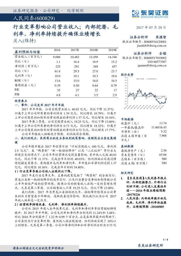 人民同泰2017年上半年受到医药行业政策变革的影响,营业收入有所下降。但公司通过内部改革,有效提升了经营效率,毛利率和净利率持续增长,保证了利润端的增长。东吴证券维持对人民同泰“买入”评级,并提示了药店业务拓展、内部整合以及招标降价等风险。