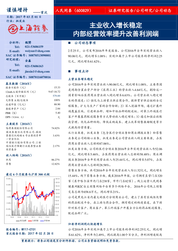 本报告分析了人民同泰2016年的经营业绩,认为公司营收稳健增长,净利润大幅提升,主要得益于毛利率上升和期间费用率下降。公司作为黑龙江省医药流通龙头,在“两票制”背景下,区域竞争优势有望进一步放大。同时,公司存在国企改革预期。综合考虑以上因素,给予“谨慎增持”评级。