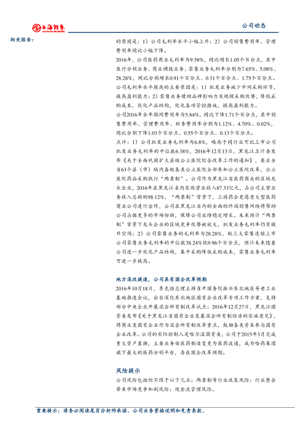 人民同泰2016年营收稳健增长,净利润大幅提升,主要得益于毛利率上升和期间费用率下降。公司作为黑龙江省医药流通龙头,在“两票制”背景下,区域竞争优势有望进一步放大。