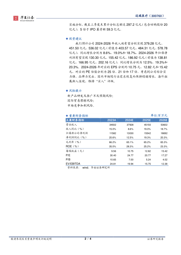本报告分析指出,迈瑞医疗在2024年第三季度面临国内市场增长承压的挑战,但海外市场保持了强劲的增长势头。公司体外诊断业务表现突出,现金流状况良好,并持续加大分红力度,回报股东。维持对公司“买入”评级,但同时也提示了新产品研发、国际贸易和市场竞争等方面的风险。