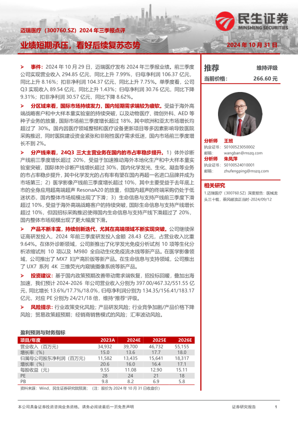 本报告对迈瑞医疗2024年三季报进行了详细分析。公司业绩短期承压,但国际市场表现亮眼,国内市场有待复苏。各产线业务表现分化,体外诊断增长迅速,医学影像稳健增长,生命信息与支持下滑。公司持续加大研发投入,不断推出高端新产品。维持“推荐”评级,但需关注行业政策、研发、竞争、贸易和汇率等多重风险。