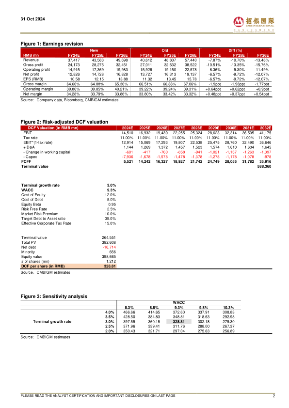下调了盈利预测,并将目标价格调整为人民币328.81元(WACC:9.3%,终端增长率:3.0%)。
