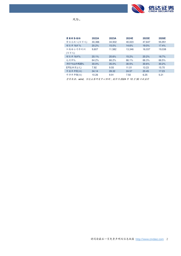 盈利预测:我们预计公司2024-2026年营业收入分别为400.23、476.47、559.51亿元,同比增速分别为14.6%、19.0%、17.4%,实现归母净利润为133.46、160.37、190.38亿元,同比分别增长15.2%、20.2%、18.7%,对应当前股价PE分别为25、20、17倍。
