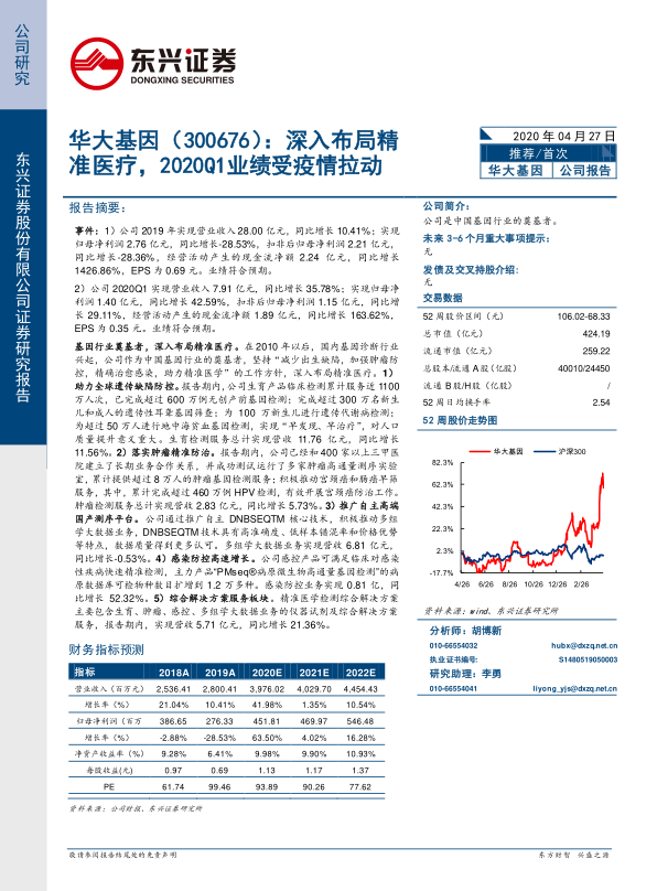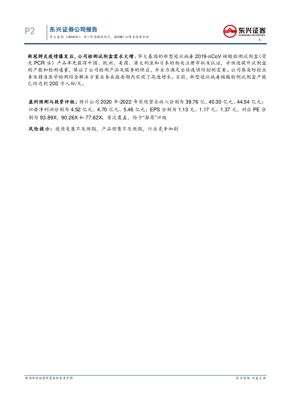 新冠疫情爆发后,华大基因的检测试剂盒需求大增,公司快速提升产能和检测通量,保证了检测产品及服务的供应,并全力满足全球疫情防控的需要。公司感染防控业务及精准医学检测综合解决方案业务在报告期内实现了高速增长。预计公司未来几年营业收入和归母净利润将保持增长,首次覆盖,给予“推荐”评级。
