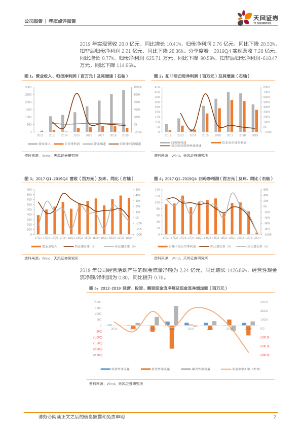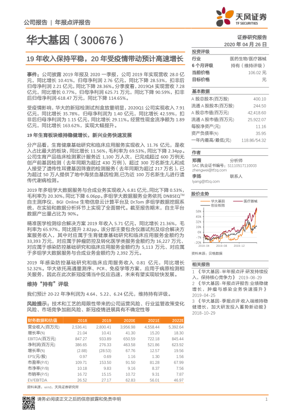 本报告对华大基因2019年年报及2020年一季报进行了详细分析。2019年公司收入保持增长,但受多种因素影响,净利润有所下降。2020年一季度,受益于新冠疫情,公司业绩预计将实现高速增长。报告分析了公司各项业务的发展情况,并维持“持有”评级,同时提示了公司面临的潜在风险。