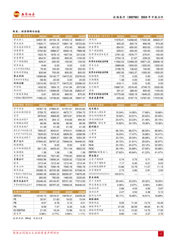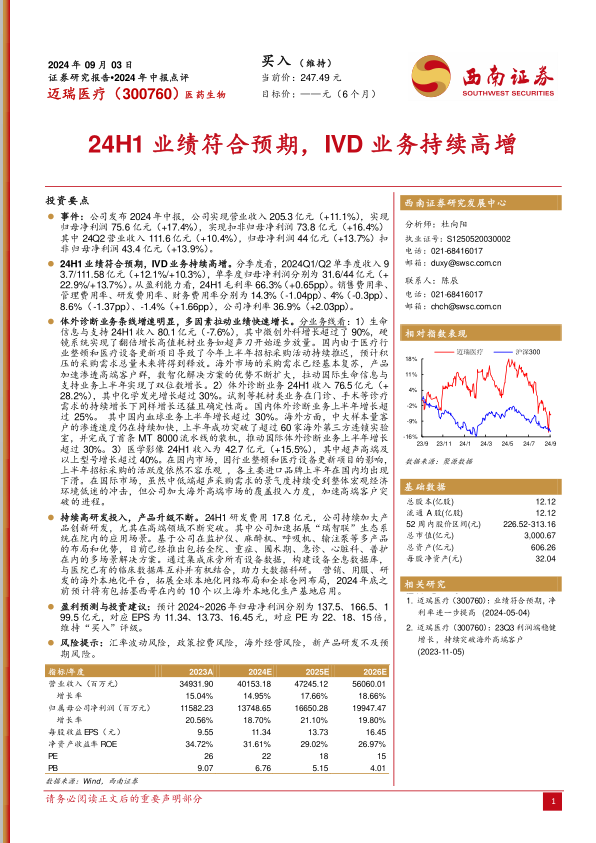 本报告对迈瑞医疗2024年中报进行了全面分析,公司业绩符合预期,体外诊断业务表现亮眼,研发投入持续加大,产品不断升级。尽管面临一些风险,但公司整体发展态势良好,维持“买入”评级。报告详细分析了各业务线的表现,并对公司未来盈利能力进行了预测,为投资者提供了有价值的参考信息。